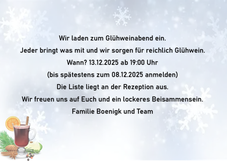 Bitte meldet euch bis zum 08.12.25 über die in der Rezeption ausliegenden Liste an. Und tragt dort auch ein was ihr mitbringt.